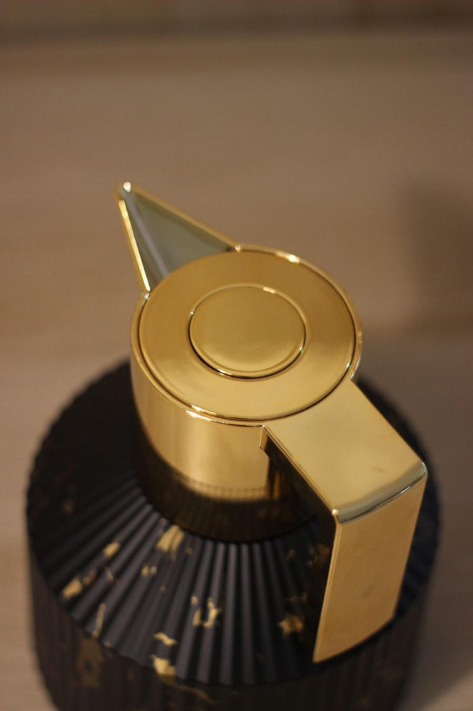 - اللمسة النهائية السوداء المذهبة تجعل هذا الترمس إضافة أنيقة وفاخرة لأي مكان، ومثالي للرحلات الطويلة والمناسبات الخاصة.